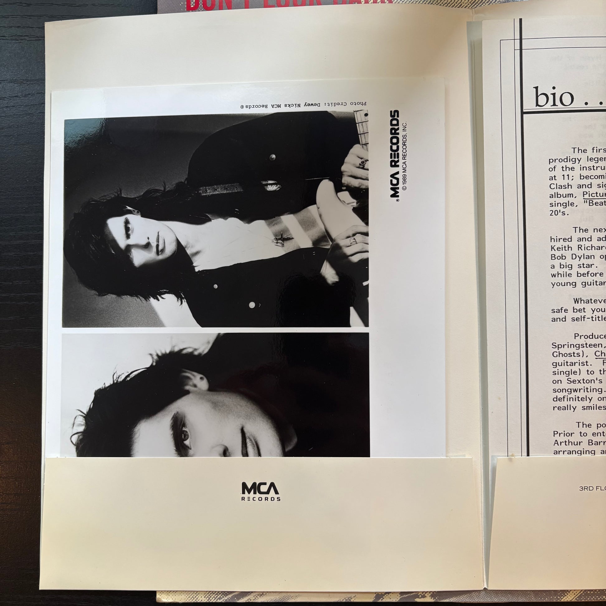 Original promotional copy comes with an MCA Records folder with promotional photos and a bio sheet. The LP itself is in very clean & glossy condition, plays great. A couple faint hairlines that do not affect play. LP has been ultrasonic and Nitty Gritty vacuum cleaned. The cover has a bit of storage wear around the edges and the bottom seam has a littel damage for an inch or two right in the middle. Gold foil promo stamp over barcode on back.